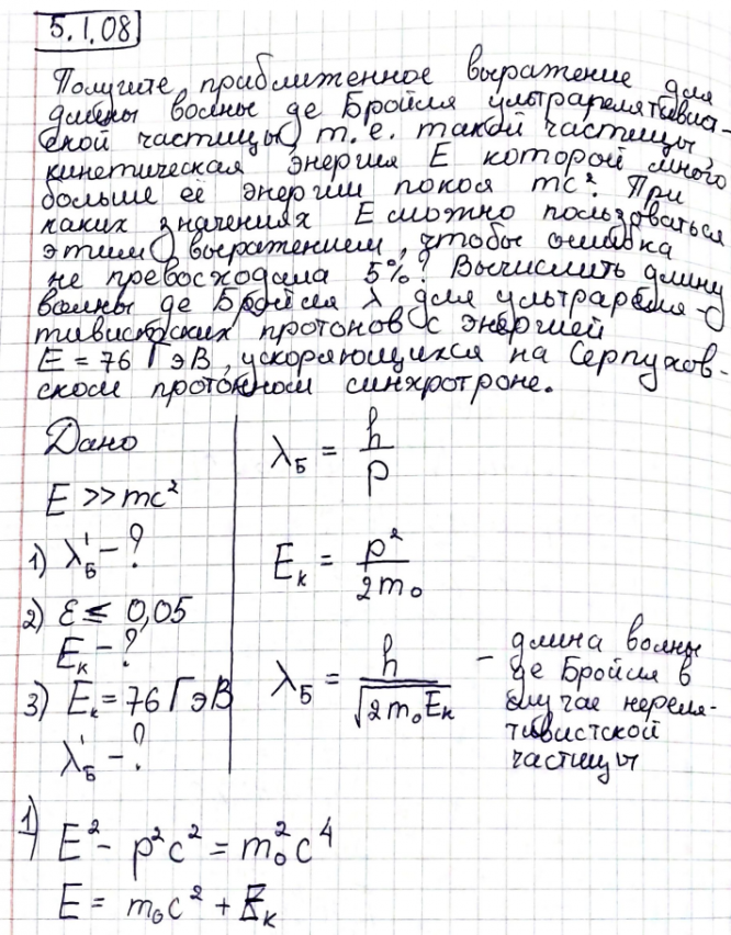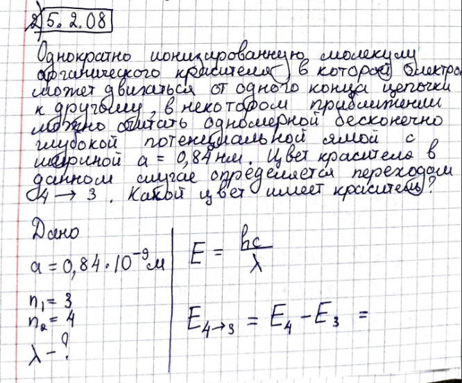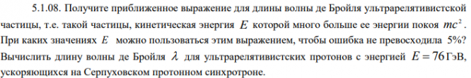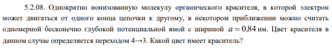 Получите приближенное выражение для длины волны де Бройля ультрарелятивистской частицы, т.е. такой частицы, кинетическая энергия E которой много больше ее энергии покоя. Однократно ионизованную молекулу органического красителя, в которой электрон может двигаться от одного конца цепочки к другому, в некотором приближении можно считать одномерной бесконечно глубокой потенциальной ямой с шириной a  0,84 нм..