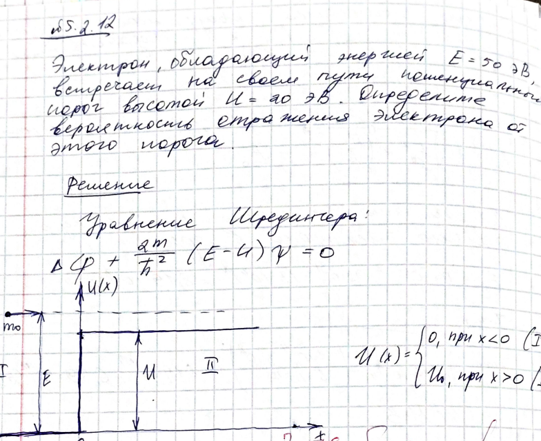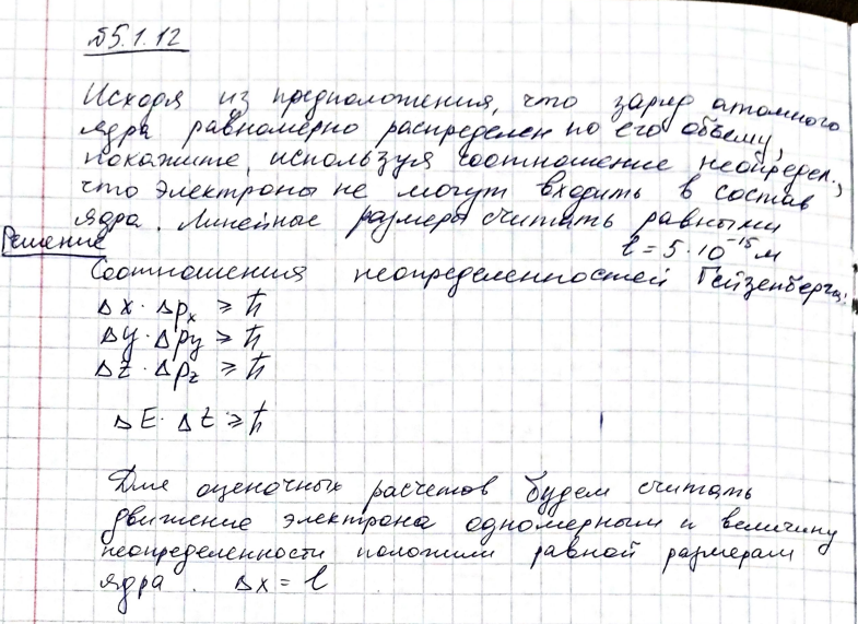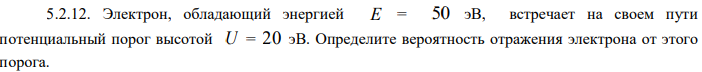Исходя из предположения, что заряд атомного ядра равномерно распределен по его объему, покажите, используя соотношение неопределенностей, что электроны не могут входить в состав ядра. Линейные размеры ядра считать равными. Электрон, обладающий энергией E = 50 эВ, встречает на своем пути потенциальный порог высотой U = 20 эВ. Определите вероятность отражения электрона от этого порога.