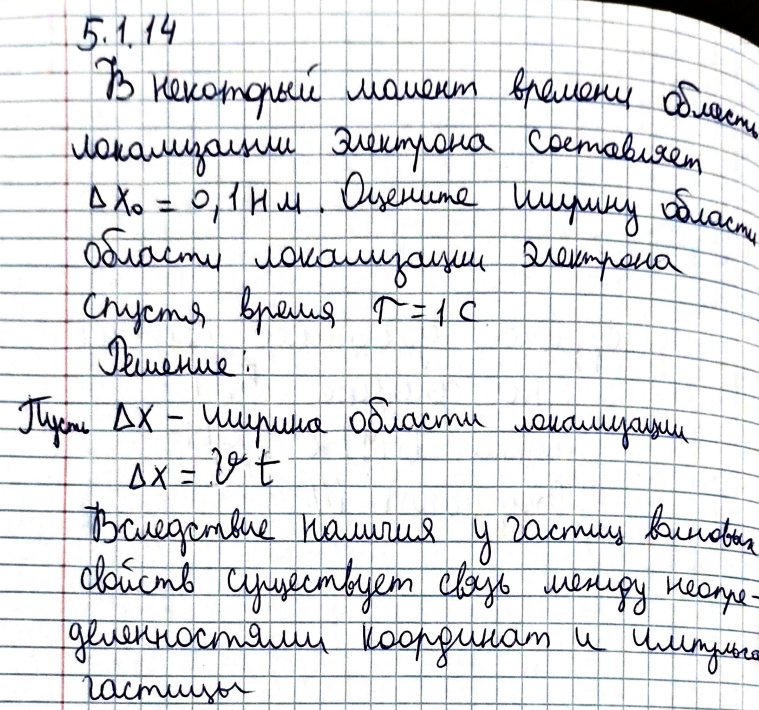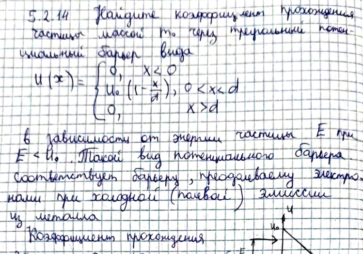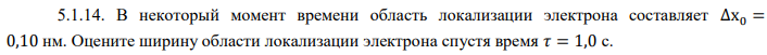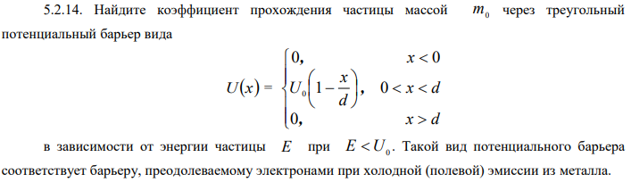 Найдите коэффициент прохождения частицы массой m0 через треугольный потенциальный барьер вида В некоторый момент времени область локализации электрона составляет Δx0 = 0,10 нм. Оцените ширину области локализации электрона спустя время 𝜏 = 1,0 с..