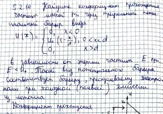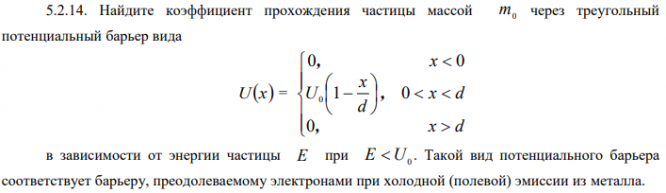 Найдите коэффициент прохождения частицы массой m0 через треугольный потенциальный барьер вида В некоторый момент времени область локализации электрона составляет Δx0 = 0,10 нм. Оцените ширину области локализации электрона спустя время 𝜏 = 1,0 с..