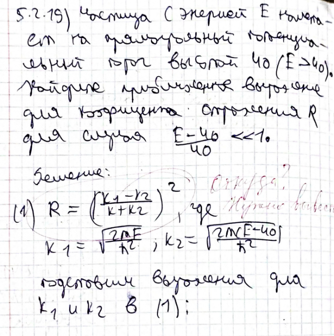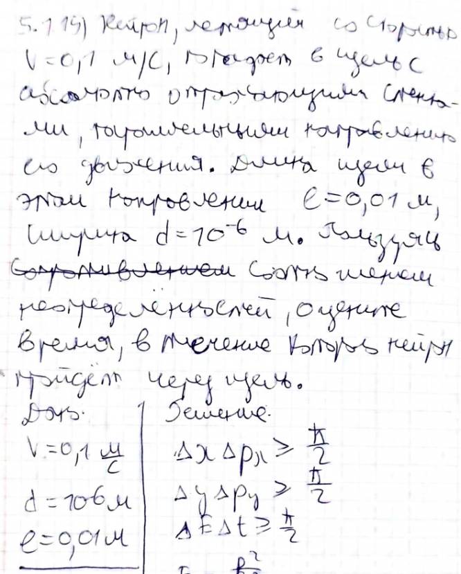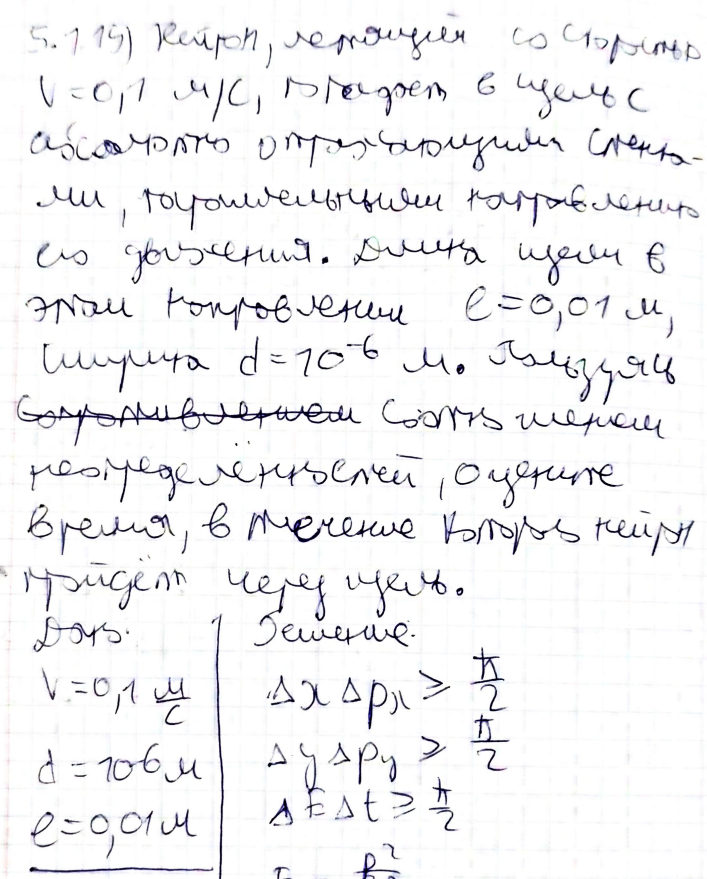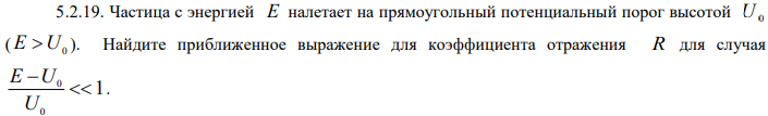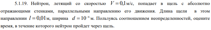 Нейтрон, летящий со скоростью V  0,1 м/с, попадает в щель с абсолютно отражающими стенками, параллельными направлению его движения. Длина щели в этом направлении l  0,01 м, ширина 6 10 d  м. Пользуясь соотношением неопределенностей, оцените время, в течение которого нейтрон пройдет через щель. Частица с энергией E налетает на прямоугольный потенциальный порог высотой U0 .