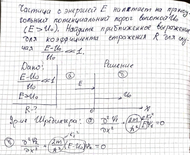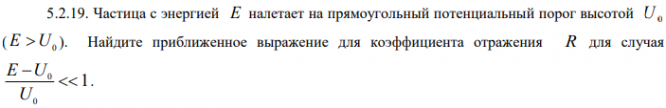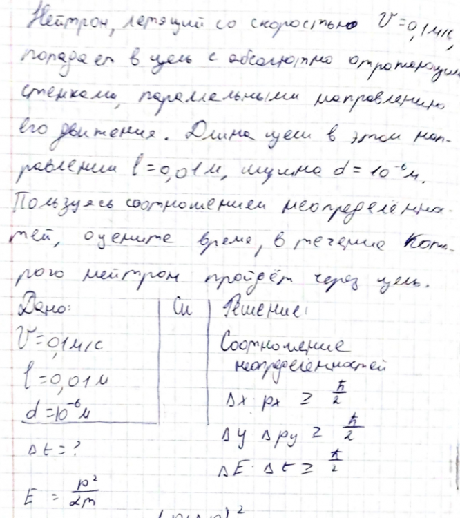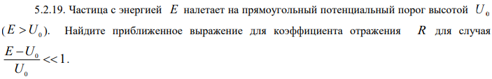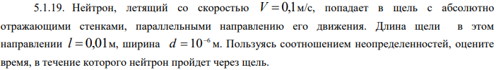 Нейтрон, летящий со скоростью V 0,1 м/с, попадает в щель с абсолютно отражающими стенками, параллельными направлению его движения. Длина щели в этом направлении l 0,01 м, ширина 6 10 d м. Частица с энергией E налетает на прямоугольный потенциальный порог высотой U.