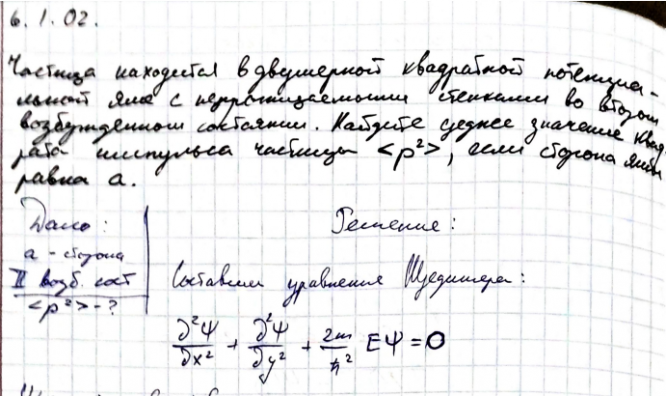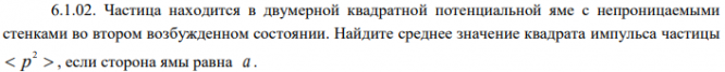 Частица находится в двумерной квадратной потенциальной яме с непроницаемыми стенками во втором возбужденном состоянии. Найдите среднее значение квадрата импульса частицы 2 p , если сторона ямы равна a .Оцените минимальную дебройлевскую длину волны свободных электронов в металле при температуре T 0 , считая, что металл содержит по одному свободному электрону на атом, а его кристаллическая решетка является простой кубической с периодом a ..