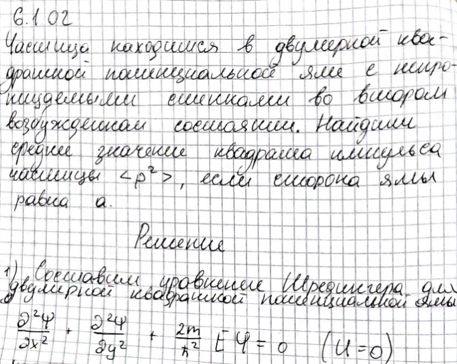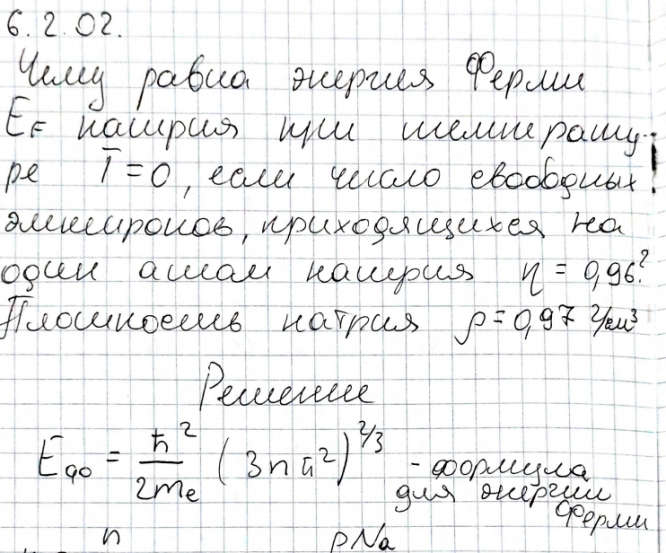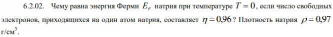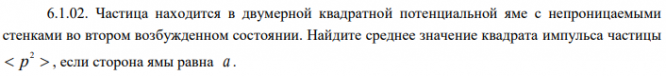 Частица находится в двумерной квадратной потенциальной яме с непроницаемыми стенками во втором возбужденном состоянии. Найдите среднее значение квадрата импульса частицы 2 p , если сторона ямы равна a . Чему равна энергия Ферми EF натрия при температуре T 0 , если число свободных электронов, приходящихся на один атом натрия, составляет 0,96 ? Плотность натрия 0,97 г/см 3 . .