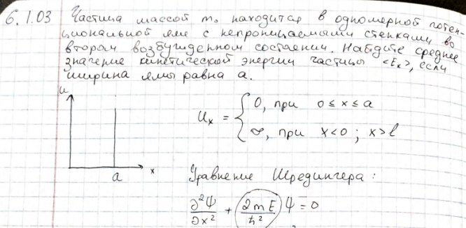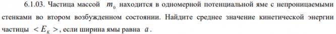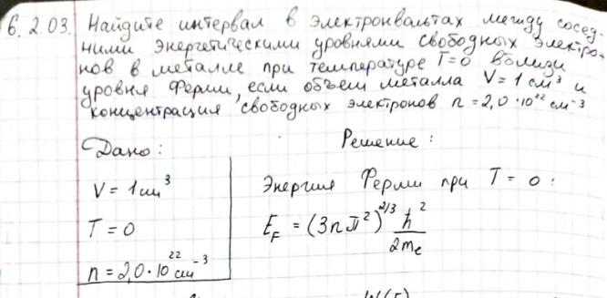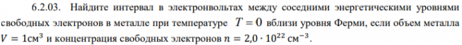 Частица массой m0 находится в одномерной потенциальной яме с непроницаемыми стенками во втором возбужденном состоянии. Найдите среднее значение кинетической энергии частицы EK , если ширина ямы равна a . Найдите интервал в электронвольтах между соседними энергетическими уровнями свободных электронов в металле при температуре T 0 вблизи уровня Ферми, если объем металла 𝑉 = 1см3 и концентрация свободных электронов 𝑛 = 2,0 ∙ 1022 см−3.