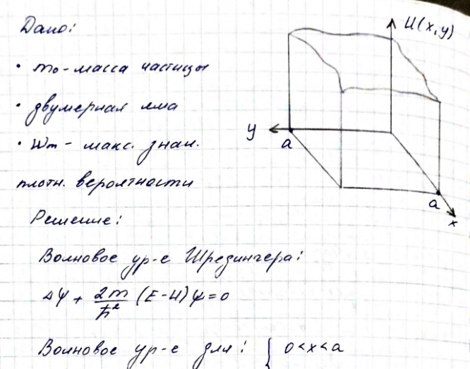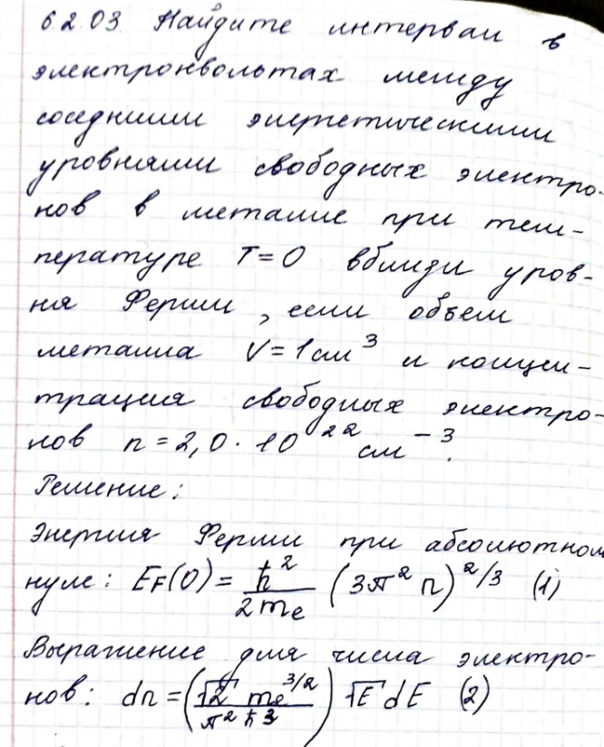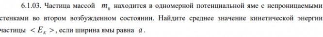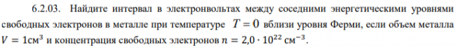 Частица массой m0 находится в одномерной потенциальной яме с непроницаемыми стенками во втором возбужденном состоянии. Найдите среднее значение кинетической энергии частицы EK , если ширина ямы равна a Найдите интервал в электронвольтах между соседними энергетическими уровнями свободных электронов в металле при температуре T 0 вблизи уровня Ферми, если объем металла 𝑉 = 1см3 и концентрация свободных электронов 𝑛 = 2,0 ∙ 1022 см−3 .