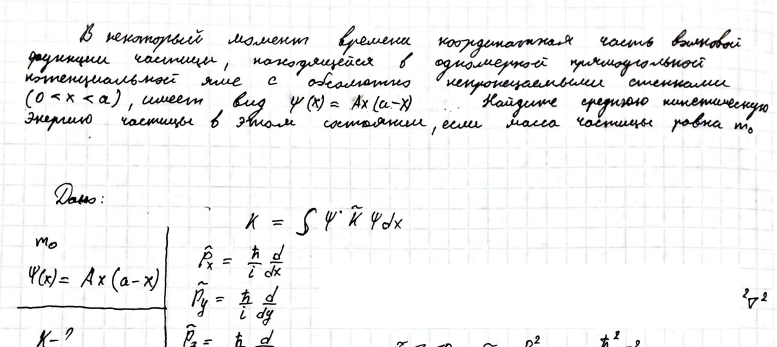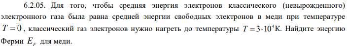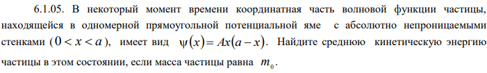 В некоторый момент времени координатная часть волновой функции частицы, находящейся в одномерной прямоугольной потенциальной яме с абсолютно непроницаемыми стенками ( 0 x a ), имеет вид. Найдите среднюю кинетическую энергию частицы в этом состоянии, если масса частицы равна m Для того, чтобы средняя энергия электронов классического (невырожденного) электронного газа была равна средней энергии свободных электронов в меди при температуре T  0 , классический газ электронов нужно нагреть до температуры 4 T  310 К. Найдите энергию Ферми EF для меди..