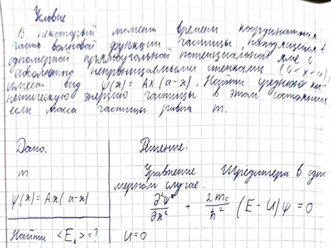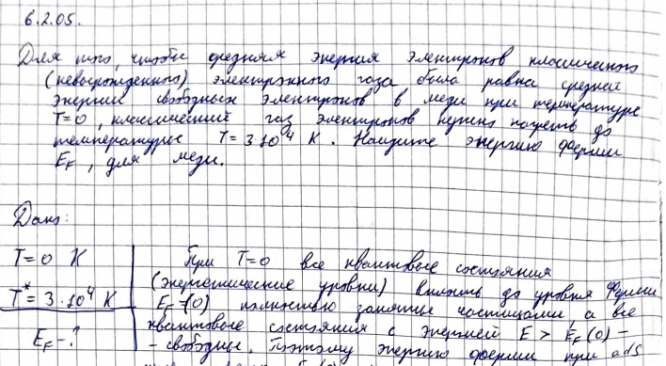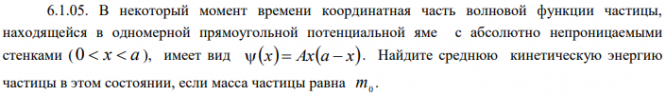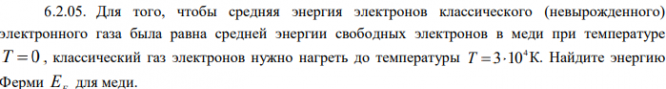 В некоторый момент времени координатная часть волновой функции частицы, находящейся в одномерной прямоугольной потенциальной яме с абсолютно непроницаемыми стенками ( 0  x  a ), имеет вид. Найдите среднюю кинетическую энергию частицы в этом состоянии, если масса частицы равна m0 . Для того, чтобы средняя энергия электронов классического (невырожденного) электронного газа была равна средней энергии свободных электронов в меди при температуре T  0 , классический газ электронов нужно нагреть до температуры 4 T  310 К. Найдите энергию Ферми EF для меди..