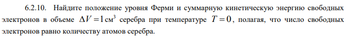 В момент времени t  0 волновая функция частицы в одномерной потенциальной яме шириной a с бесконечно высокими стенками имеет вид. Найдите положение уровня Ферми и суммарную кинетическую энергию свободных электронов в объеме V 1 см3 серебра при температуре T  0 , полагая, что число свободных электронов равно количеству атомов серебра..
