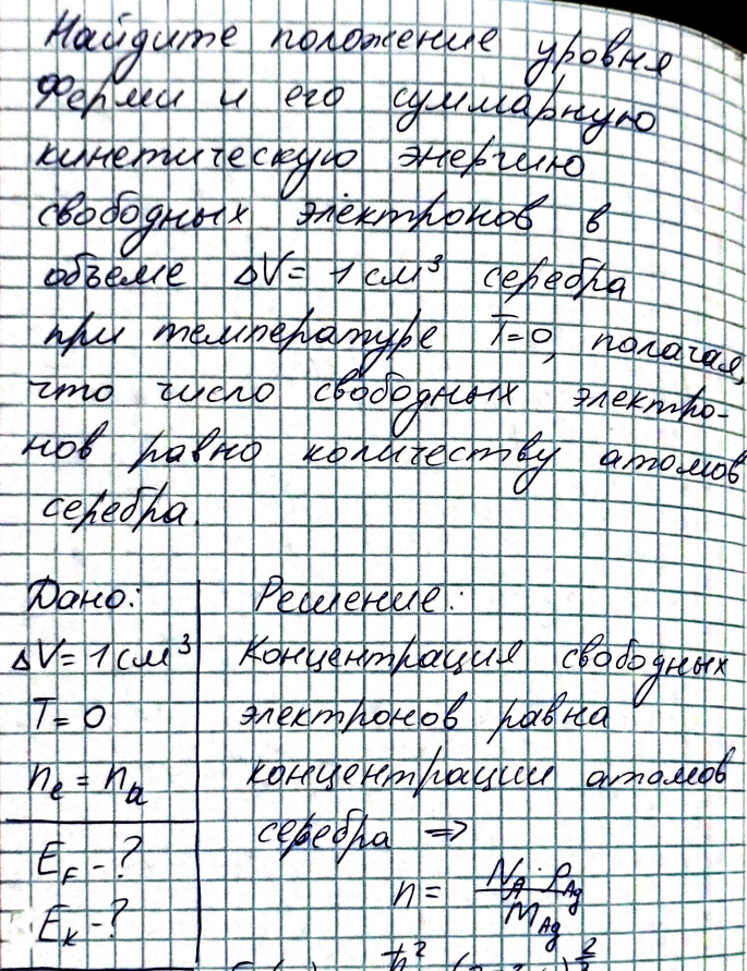 В момент времени t 0 волновая функция частицы в одномерной потенциальной яме шириной a с бесконечно высокими стенками имеет вид. Найдите положение уровня Ферми и суммарную кинетическую энергию свободных электронов в объеме V 1 см3 серебра при температуре T 0 , полагая, что число свободных электронов равно количеству атомов серебра..