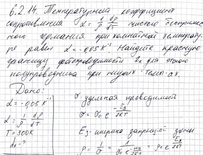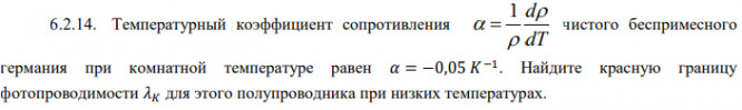 В момент времени t 0 волновая функция частицы в одномерной потенциальной яме шириной a с непроницаемыми стенками является равновероятной суперпозицией второго и четвертого возбужденных состояний. Считая, что масса частицы равна m0 , найдите среднее значение импульса частицы в данном состоянии. Температурный коэффициент сопротивления чистого беспримесного германия при комнатной температуре равен 𝛼 = −0,05 𝐾 −1 . Найдите красную границу фотопроводимости 𝜆𝐾 для этого полупроводника при низких температурах. .