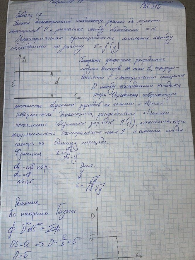 Построить графически распределение модулей векторов электрического поля Е, поляризованности Р и электрического смещения D между обкладками конденсатора. Определить поверхностную плотность связанных зарядов на нижней и верхней поверхностях диэлектрика, распределение объёмной плотности связанных зарядов , максимальную напряжённость электрического поля Е и ёмкость конденсатора на единицу площади.