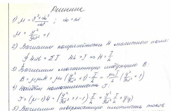 Построить графически распределения модулей векторов индукции B и напряжённости H магнитного поля, а также вектора намагниченности J в зависимости от у в интервале значений от 0 до d. Определить поверхностную плотность токов намагничивания на верхней и нижней поверхностях магнетика и распределение объёмной плотности токов намагничивания .Определить индуктивность единицы длины этой двухполосной линии. Функция = f(y) имеет вид: