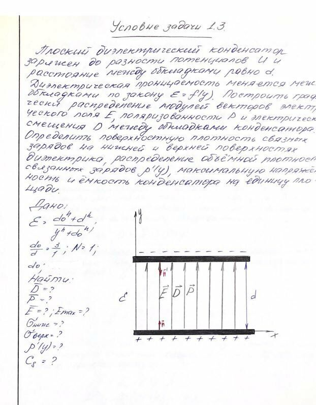 Построить графически распределение модулей векторов электрического поля Е, поляризованности Р и электрического смещения D между обкладками конденсатора. Определить поверхностную плотность связанных зарядов на нижней и верхней поверхностях диэлектрика, распределение объёмной плотности связанных зарядов , максимальную напряжённость электрического поля Е и ёмкость конденсатора на единицу площади.