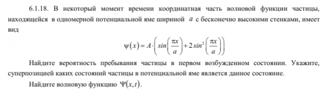 Задача 6.1.18. В некоторый момент времени координатная часть волновой функции частицы, находящейся в одномерной потенциальной яме шириной с бесконечно высокими стенками, имеет вид.