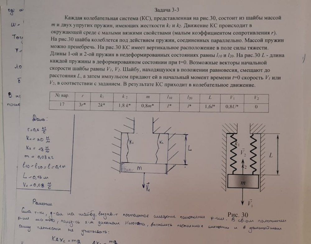 Вариант 17 - ДЗ №3 - КолебанияКаждая колебательная система (КС), представленная на рис. 28, 29, 30, 31, состоит из шайбы массой m и двух упругих пружин, имеющих жесткости k1 и k2 . Движение КС происходит в окружающей среде с малыми вязкими свойствами (малым коэффициентом сопротивления r). На рис. 28, 30 шайба колеблется под действием пружин, соединенных параллельно, а на рис. 29, 31 колебания происходят под действием пружин, соединенных последовательно. Массой пружин можно пренебречь. На рис. 28, 29 КС имеет горизонтальное расположение, а на рис. 30, 31 вертикальное расположение в поле силы тяжести. Длины 1-ой и 2-ой пружин в недеформированных состояниях равны l10 и l20. На рис.28, 30 L - длина каждой пружины в деформированном состоянии при t=0. На рис.29, 31 L - общая длина двух пружин в деформированном состоянии при t=0. Возможные векторы начальной скорости шайбы равны V1, V2. Шайбу, находящуюся в положении равновесия, смещают до расстояния L, а затем импульсом придают ей в начальный момент времени t=0 скорость V1 или V2 , в соответствии с заданием (см. таблицы №10 - 13). В результате КС приходит в колебательное движение.