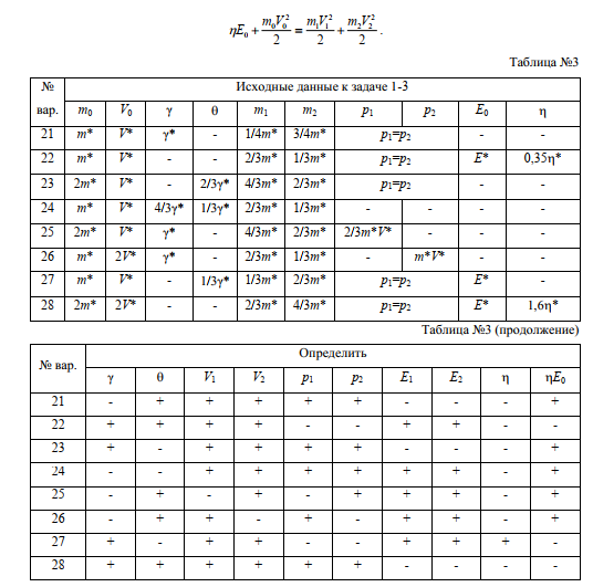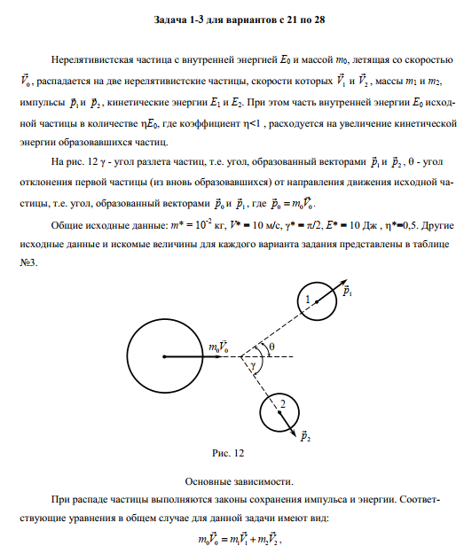 Нерелятивистская частица с внутренней энергией E0 и массой m0, летящая со скоростьюV0,распадается на две нерелятивистские частицы, скорости которых V1иV2, массы m1 и m2,импульсы p1иp2, кинетические энергии E1 и E2. При этом часть внутренней энергии E0 исходной частицы в количестве ,где коэффициент <1 , расходуется на увеличение кинетическойэнергии образовавшихся частиц.