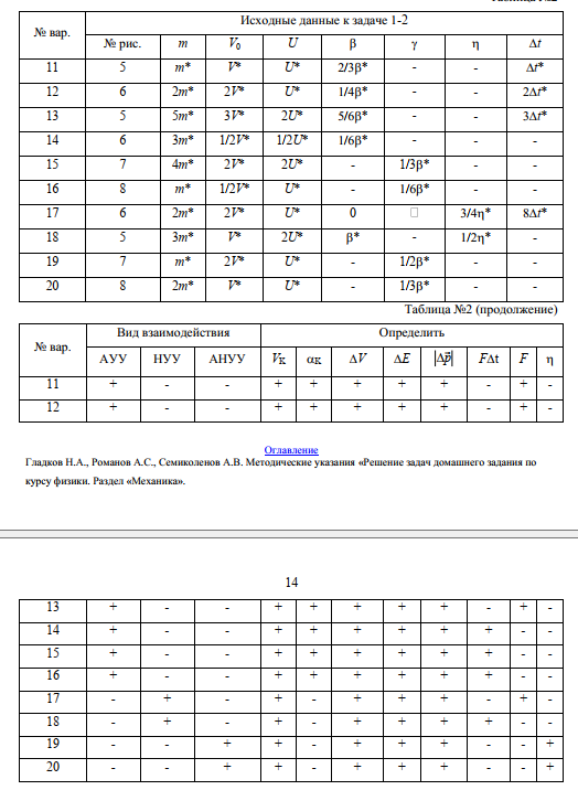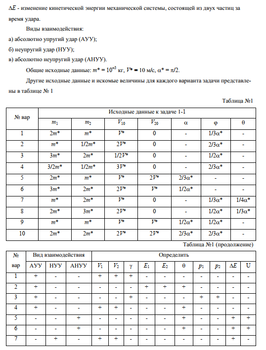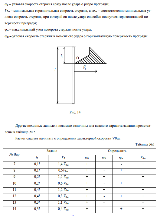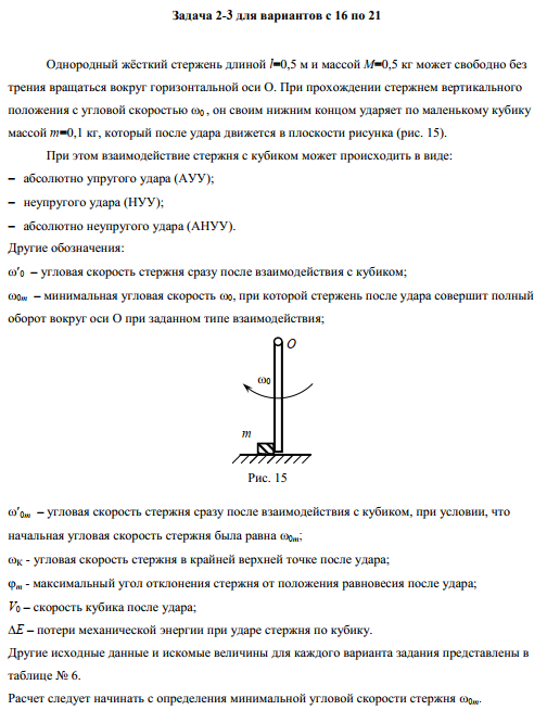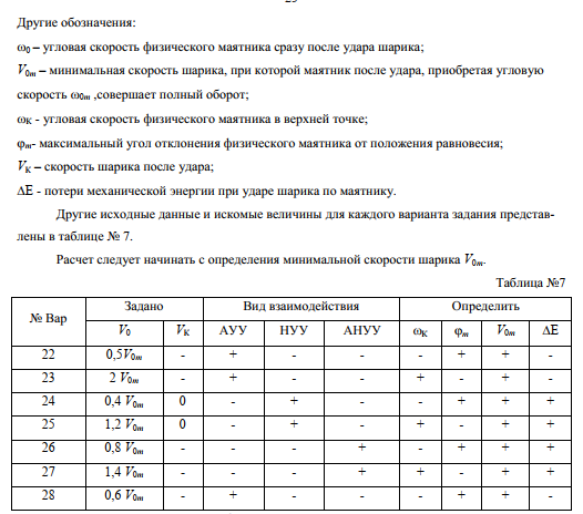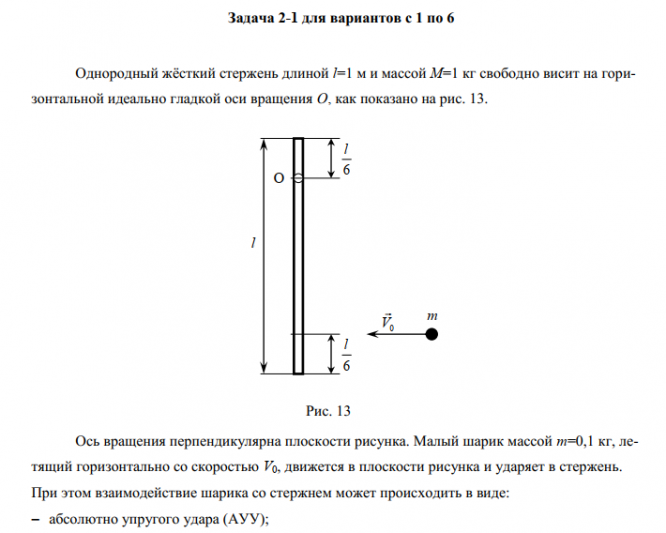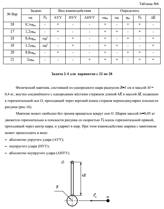 Малый шарик массой m=0,1кг, летящий горизонтально со скоростью , движется в плоскости рисунка и ударяет в стержень. При этом взаимодействие шарика со стержнем может происходить в виде: абсолютно упругого удара (АУУ); неупругого удара (НУУ); абсолютно неупругого удара (АНУУ). Сразу после удара стержень вращается с угловой скоростью , а шарик приобретает скорость и продолжает двигаться в плоскости рисунка. Другие обозначения: - минимальная начальная скорость шарика, при которой стержень после удара совершает полный оборот; - соответственно минимальная угловая скорость стержня, при которой стержень после удара совершает полный оборот; - угловая скорость стержня при прохождении им крайней верхней точки; - максимальный угол отклонения стержня от положения равновесия. DE - потеря энергии при ударе; Другие исходные данные и искомые величины для каждого варианта задания представлены в таблице:.