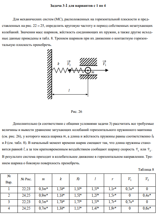 Для механических систем (МС), расположенных на горизонтальной плоскости и представленных на рис. 22 – 25, определить круговую частоту и период собственных незатухающих колебаний. Значения масс шариков, жёсткость соединяющих их пружин, а также другие исходные данные приведены в табл. 8. Трением шариков при их движении о контактную горизонтальную плоскость пренебречь.
