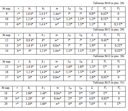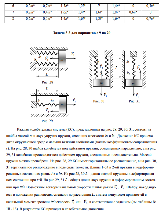 Каждая колебательная система (КС), представленная на рис. 28, 29, 30,31, состоит изшайбы массой m и двух упругих пружин, имеющих жесткости k1 и k2. Движение КС происходит в окружающей среде с малыми вязкими свойствами (малым коэффициентом сопротивленияr). На рис. 28, 30 шайба колеблется под действием пружин, соединенных параллельно, а на рис.29, 31 колебания происходят под действием пружин, соединенных последовательно. Массойпружин можно пренебречь. На рис. 28, 29 КС имеет горизонтальное расположение, а на рис. 30,31 вертикальное расположение в поле силы тяжести. Длины 1-ой и 2-ой пружин в недеформированных состояниях равны l10 и l20. На рис.28,30 L - длина каждой пружины в деформированном состоянии при t=0. На рис.29, 31 L - общая длина двух пружин в деформированном состоянии при t=0. Возможные векторы начальной скорости шайбы равны V1, V2. Шайбу, находящуюся в положении равновесия, смещают до расстояния L, а затем импульсом придают ей вначальный момент времени t=0 скорость V1 или V2, в соответствии с заданием (см. таблицы №10-13).В результате КС приходит в колебательное движение.