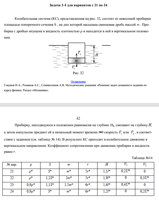 Пробирку, находящуюся в положении равновесия на глубине Н0, смещают на глубину H,а затем импульсом придают ей в начальный момент времени t=0 скорость V1 или V2 , в соответствии с заданием (см. таблицу № 14). В результате КС приходит в колебательное движение ввертикальном направлении. Коэффициент сопротивления при движении пробирки в жидкостиравен r.