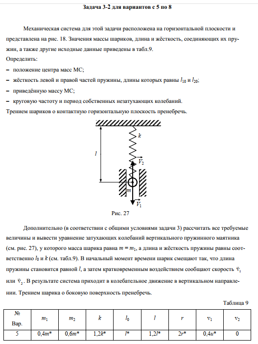 Механическая система для этой задачи расположена на горизонтальной плоскости ипредставлена на рис. 18. Значения массы шариков, длина и жёсткость, соединяющих их пружин, а также другие исходные данные приведены в табл.9.