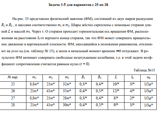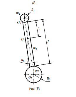 На рис. 33 представлен физический маятник (ФМ), состоящий из двух шаров радиусами R1 и R2, и массами соответственно m1 и m2. Шары жёстко скреплены с помощью стержня длиной L и массой m3. Через т. О стержня проходит горизонтальная ось вращения ФМ, расположенная на расстоянии l0 от верхнего конца стержня, так что ФМ может совершать вращательное движение в вертикальной плоскости. ФМ, находящийся в положении равновесия, отклоняют на угол (см. таблицу № 15), а затем в начальный момент времени отпускают.