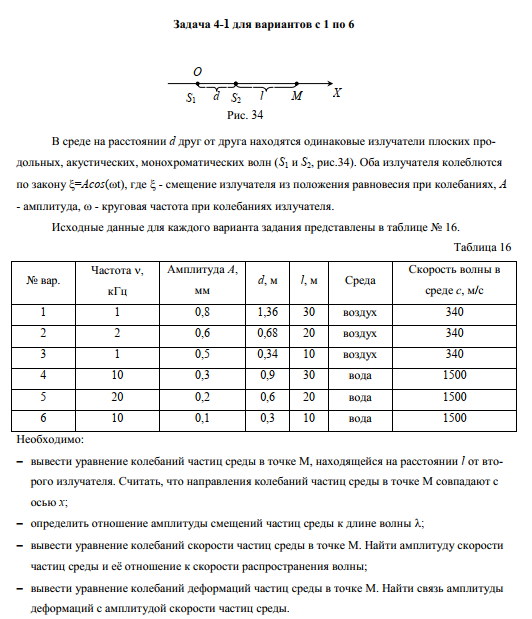 В среде на расстоянии d друг от друга находятся одинаковые излучатели плоских продольных, акустических, монохроматических волн (S1 и S2, рис.34). Оба излучателя колеблются