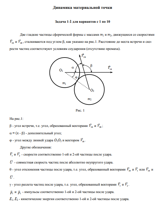 Две гладкие частицы сферической формы с массами m1 и m2, движущиеся со скоростями и, сталкиваются под углом , как указано на рис.1