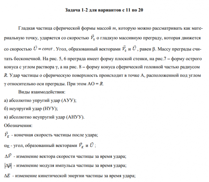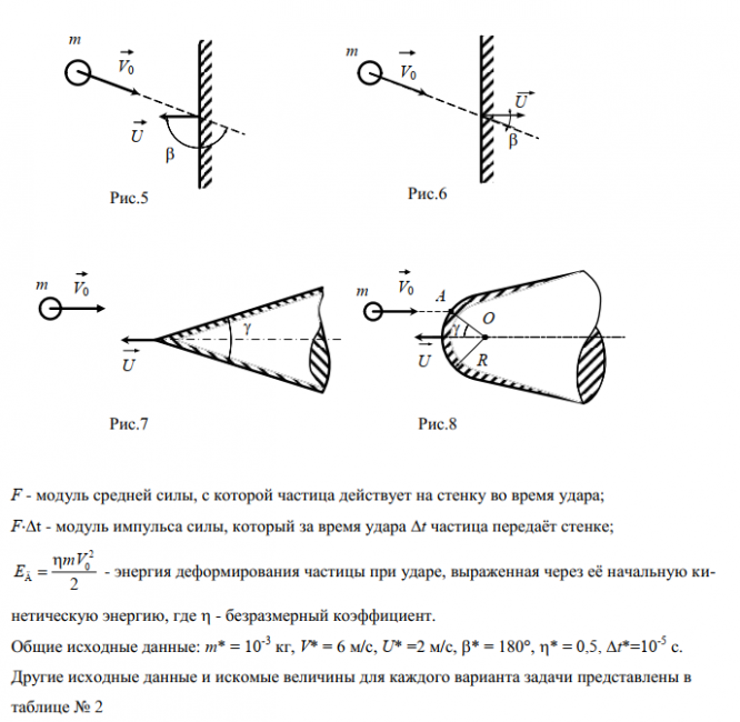 Гладкая частица сферической формы массой m, которую можнорассматривать как материальную точку, ударяется со скоростью V0о гладкую массивную преграду, которая движетсясо скоростью U = const. Угол, образованный векторами V0и U, равен . Массу преграды считать бесконечной. На рис. 5, 6 преграда имеет форму плоской стенки, на рис.7 – форму острогоконуса с углом раствора γ, а на рис. 8 – форму конуса сферической головной частью радиусомR. Удар частицы о сферическую поверхность происходит в точке А, расположенной под угломγ относительнооси преграды. При этом АО = R.