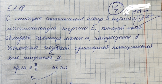 5.1.18. С помощью соотношения неопределенностей оцените минимальную энергию E1 , которой может обладать частица массы m , находящаяся в бесконечно глубокой одномерной потенциальной яме шириной а .