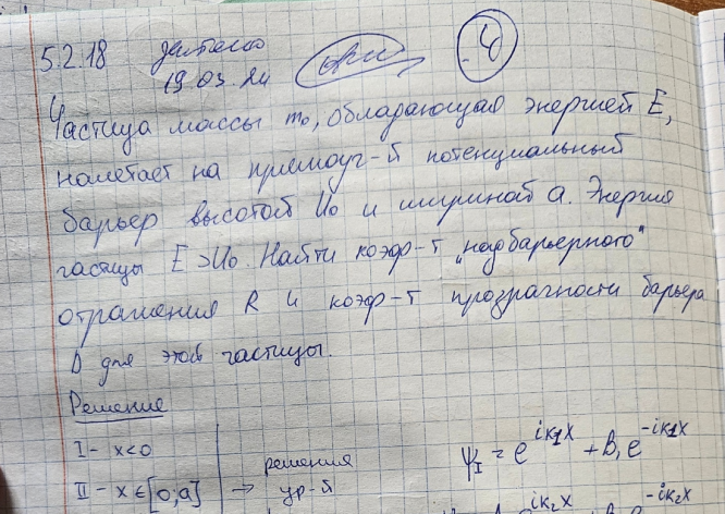5.2.18. Частица массы m0 , обладающая энергией E , налетает на прямоугольный потенциальный барьер высотой U0 и шириной a . Энергия частицы E U0 . Найдите коэффициент “надбарьерного” отражения R и коэффициент прозрачности барьера D для этой частицы