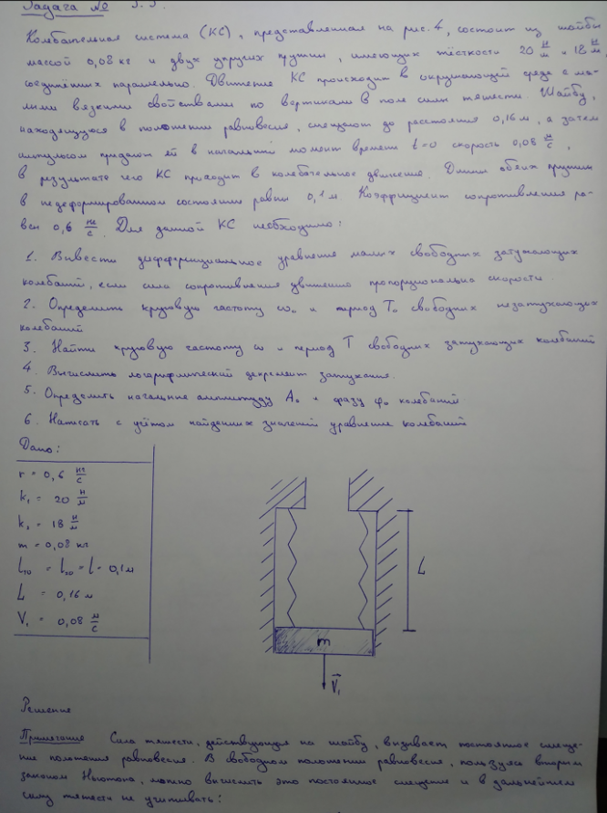 Каждая колебательная система (КС), представленная на рис. 28, 29, 30, 31, состоит из шайбы массой m и двух упругих пружин, имеющих жесткости k1 и k2 . Движение КС происходит в окружающей среде с малыми вязкими свойствами (малым коэффициентом сопротивления r). На рис. 28, 30 шайба колеблется под действием пружин, соединенных параллельно, а на рис. 29, 31 колебания происходят под действием пружин, соединенных последовательно. Массой пружин можно пренебречь. На рис. 28, 29 КС имеет горизонтальное расположение, а на рис. 30, 31 вертикальное расположение в поле силы тяжести. Длины 1-ой и 2-ой пружин в недеформированных состояниях равны l10 и l20. На рис.28, 30 L - длина каждой пружины в деформированном состоянии при t=0. На рис.29, 31 L - общая длина двух пружин в деформированном состоянии при t=0. Возможные векторы начальной скорости шайбы равны V1, V2. Шайбу, находящуюся в положении равновесия, смещают до расстояния L, а затем импульсом придают ей в начальный момент времени t=0 скорость V1 или V2 , в соответствии с заданием (см. таблицы №10 - 13). В результате КС приходит в колебательное движение.