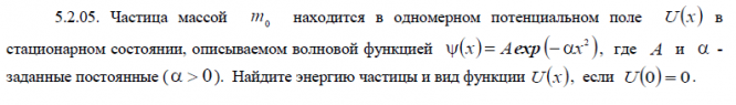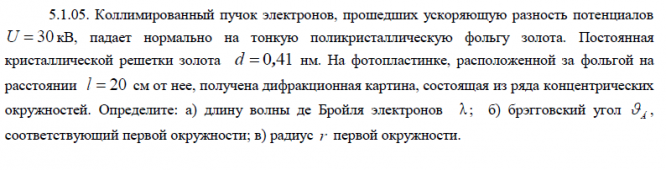 5.1.05. Коллимированный пучок электронов, прошедших ускоряющую разность потенциалов U  30 кВ, падает нормально на тонкую поликристаллическую фольгу золота. Постоянная кристаллической решетки золота d  0,41 нм. На фотопластинке, расположенной за фольгой на расстоянии l  20 см от нее, получена дифракционная картина, состоящая из ряда концентрических окружностей. Определите: а) длину волны де Бройля электронов  ; б) брэгговский угол Á  , соответствующий первой окружности; в) радиус r первой окружности. 5.2.05. Частица массой 0 m находится в одномерном потенциальном поле Ux в стационарном состоянии, описываемом волновой функцией    2   x  Aexp  x , где A и  - заданные постоянные (  0).