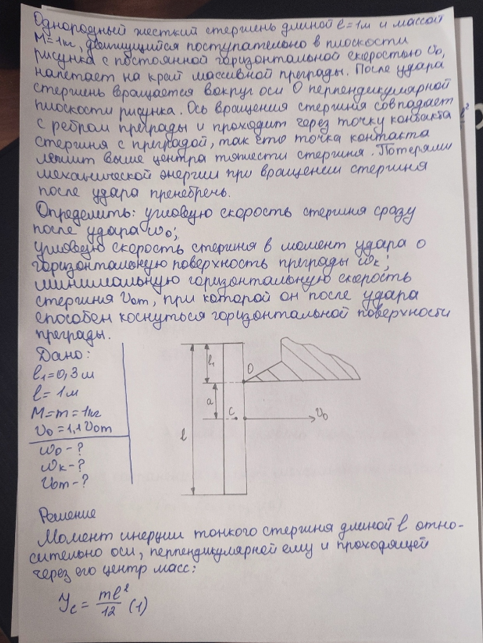 ω0 – угловая скорость стержня сразу после удара о ребро преграды;