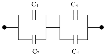 • 3.6. Четыре конденсатора С1 = 30 пФ, C2 = 10 пФ, С3 = 55 пФ и С4 = 5 пФ соединены между собой так, как показано на рисунке. Заряд на конденсаторе С4 равен 0,5 нКл. Найти заряды и разности потенциалов на обкладках каждого конденсатора, а также общий заряд и разность по­тенциалов на всей батарее конденса­торов.