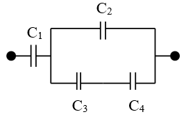 • 3.13. Четыре конденсатора С1 = 30 пФ, C2 = 12 пФ, С3 = 10 пФ и C4 = 40 пФ соединены между собой так, как показано на рисунке. Определить заряды конденсаторов и разности потенциалов между их обкладками, если разность потен­циалов между точками А и В равна 300 В.