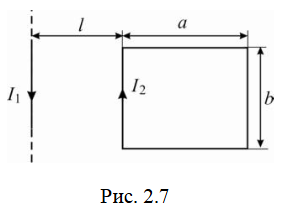 • 2.26. По длинному прямому проводнику течет ток I1. Рядом с этим проводником расположена прямоугольная рамка со сторонами Ь и а, по которой течет ток I2. Ближайшая сторона рамки находится на расстоянии I от проводника (рис. 2.7). Определить силу, действующую на ток I2 со стороны магнитного поля тока I1.