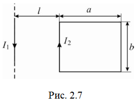 - 2.27. По длинному прямому проводнику течет ток I1. Рядом с этим проводником расположена прямоугольная рамка со сторонами Ь и а, по которой течет ток I2. Ближайшая сторона рамки находится на расстоянии I от проводника (рис. 2.7). Вычислить работу, которую необходимо совершить, чтобы удалить рамку из магнитного поля.