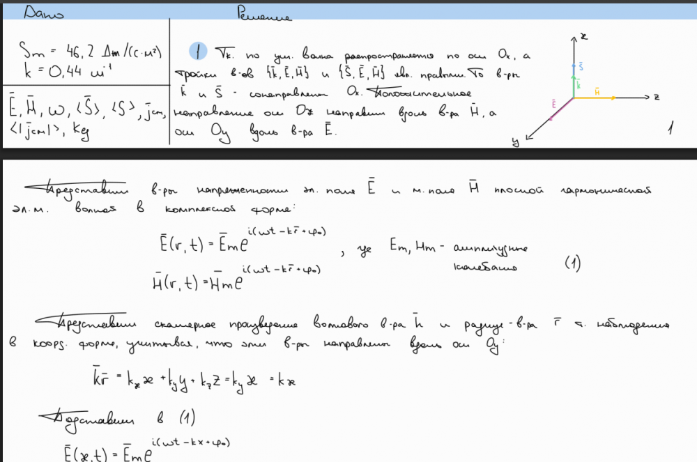Плоская гармоническая электромагнитная волна распространяется в вакууме в положительном направлении оси Ox. Вектор плотности потока электромагнитной энергии S имеет вид: . Считая волновое число k и амплитудное значение вектора известными действительными величинами, что допустимо для однородной изотропнойсреды без эффектов поглощения, найти: