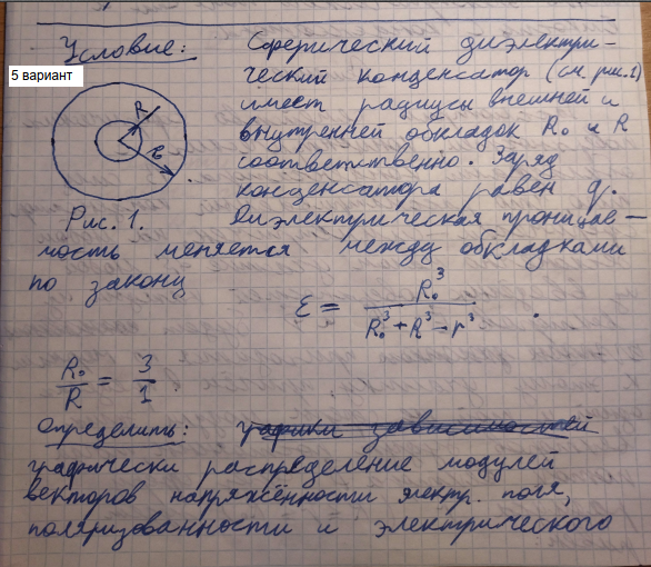 Сферический диэлектрический конденсатор имеет радиусы внешней и внутренней обкладок R0 и R. Заряд конденсатора равен q. 8 страниц с графиками