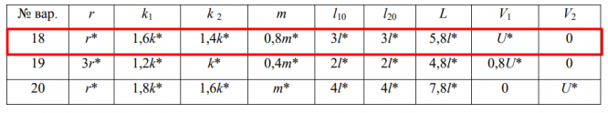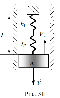Каждая колебательная система (КС), представленная на рис. 28, 29, 30, 31, состоит из шайбы массой m и двух упругих пружин, имеющих жесткости k1 и k2 . Движение КС происходит в окружающей среде с малыми вязкими свойствами (малым коэффициентом сопротивления r). На рис. 28, 30 шайба колеблется под действием пружин, соединенных параллельно, а на рис. 29, 31 колебания происходят под действием пружин, соединенных последовательно. Массой пружин можно пренебречь. На рис. 28, 29 КС имеет горизонтальное расположение, а на рис. 30, 31 вертикальное расположение в поле силы тяжести. Длины 1-ой и 2-ой пружин в недеформированных состояниях равны l10 и l20. На рис.28, 30 L - длина каждой пружины в деформированном состоянии при t=0. На рис.29, 31 L - общая длина двух пружин в деформированном состоянии при t=0. Возможные векторы начальной скорости шайбы равны V1 , V2 . Шайбу, находящуюся в положении равновесия, смещают до расстояния L, а затем импульсом придают ей в начальный момент времени t=0 скорость V1 или V2 , в соответствии с заданием (см. таблицы № 10 - 13). В результате КС приходит в колебательное движение.