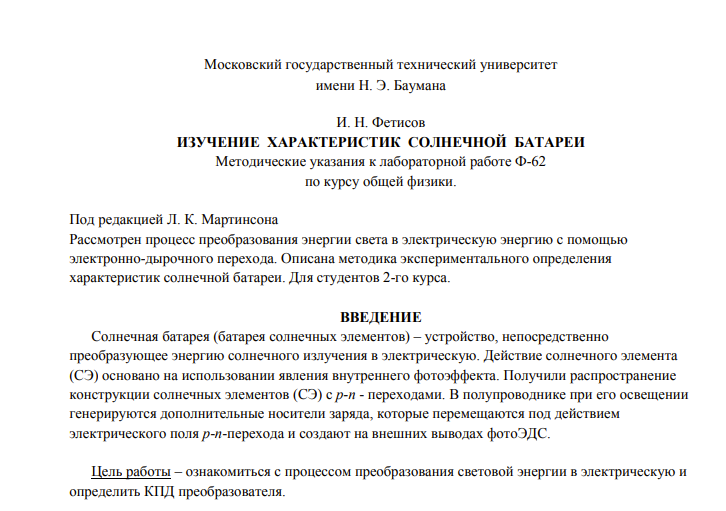 Для студентов МГТУ им. Н.Э.Баумана по предмету ФизикаИзучение характеристик солнечной батареиИзучение характеристик солнечной батареи