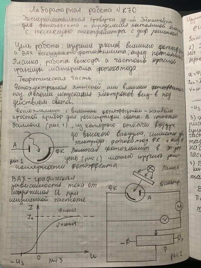 Для студентов МГТУ им. Н.Э.Баумана по предмету ФизикаЭкспериментальная проверка уравнений Эйнштейна для фотоэффекта и определение постоянной Планка с помощью спектрометра с дифракционной решеткойЭкспериментальная проверка уравнений Эйнштейна для фотоэффекта и определение постоянной Планка с помощью спектрометра с дифракционной решеткой