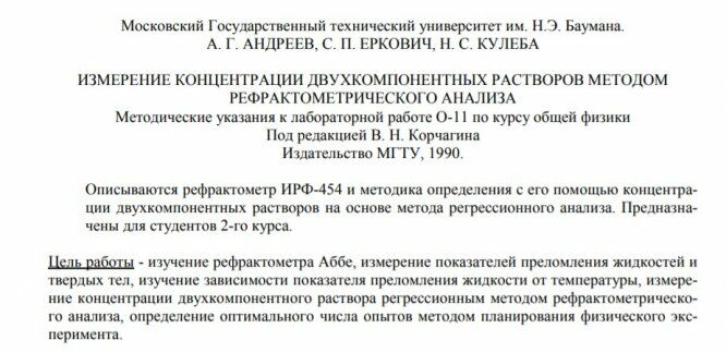 Для студентов МГТУ им. Н.Э.Баумана по предмету ФизикаИзмерение концентрации двухкомпонентных растворов методом рефрактометрического анализаИзмерение концентрации двухкомпонентных растворов методом рефрактометрического анализа