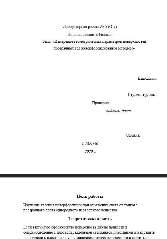 Главная » Учебные материалы » Физика » Лабораторные работы » МГТУ им. Н.Э.Баумана » 3 семестр » Номер О » Вариант 7 » Интерференция в тонких пленках. Определение геометрических параметров поверхностей прозрачных тел интерференционным методом