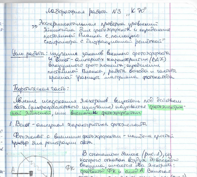 Главная » Учебные материалы » Физика » Лабораторные работы » МГТУ им. Н.Э.Баумана » 4 семестр » Номер К » Вариант 70 » Экспериментальная проверка уравнений Эйнштейна для фотоэффекта и определение постоянной Планка с помощью спектрометра с дифракционной решеткой