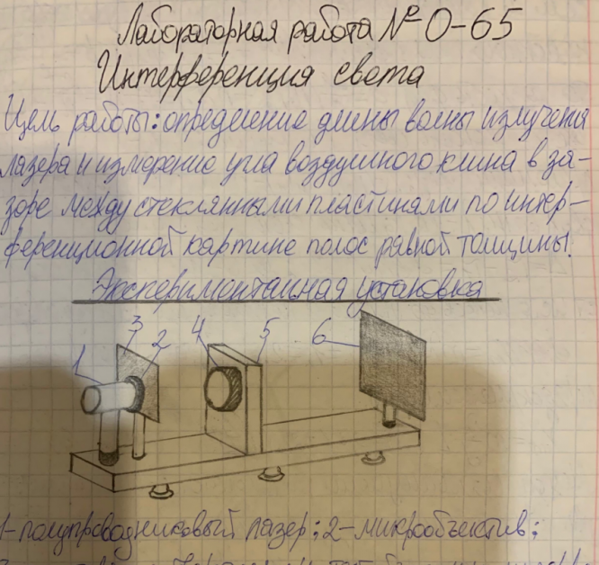ЦЕЛЬ РАБОТЫ: определение длины волны излучения лазера и измерение угла воздушного клина в зазоре между стеклянными пластинами по интерференционной картине полос равной толщины.