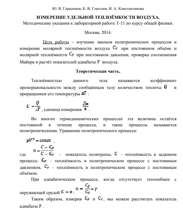 Для студентов МГТУ им. Н.Э.Баумана по предмету ФизикаИзмерение удельной теплоемкости воздухаИзмерение удельной теплоемкости воздуха