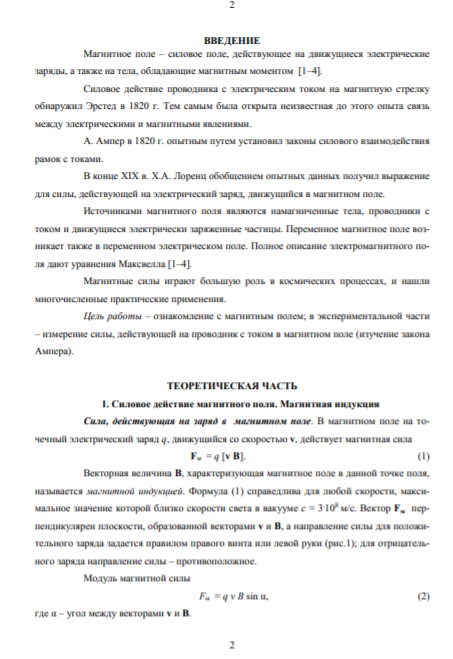 Цель работы – ознакомление с магнитным полем; в экспериментальной части – измерение силы, действующей на проводник с током в магнитном поле (изучение закона Ампера).